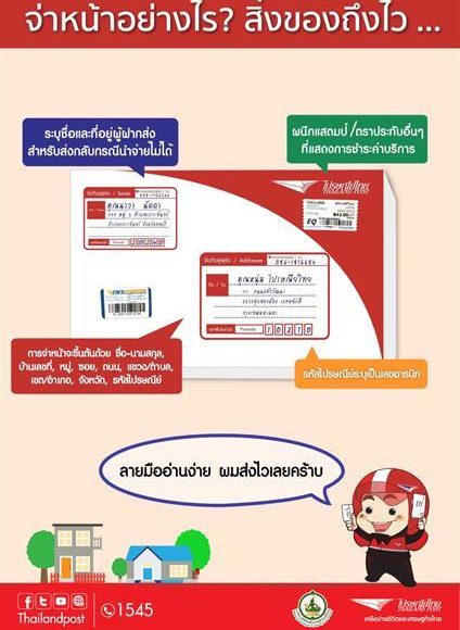 บริษัท ไปรษณีย์ไทย จำกัด (ปณท.) รณรงค์ผู้ใช้บริการเขียนจ่าหน้ากล่องและซองให้ถูกต้องชัดเจน ก่อนฝากส่งผ่านเส้นทางไปรษณีย์ เพื่อความสะดวกรวดเร็วในการใช้บริการรวมถึงการส่งต่อไปยังปลายทางได้ถูกต้อง